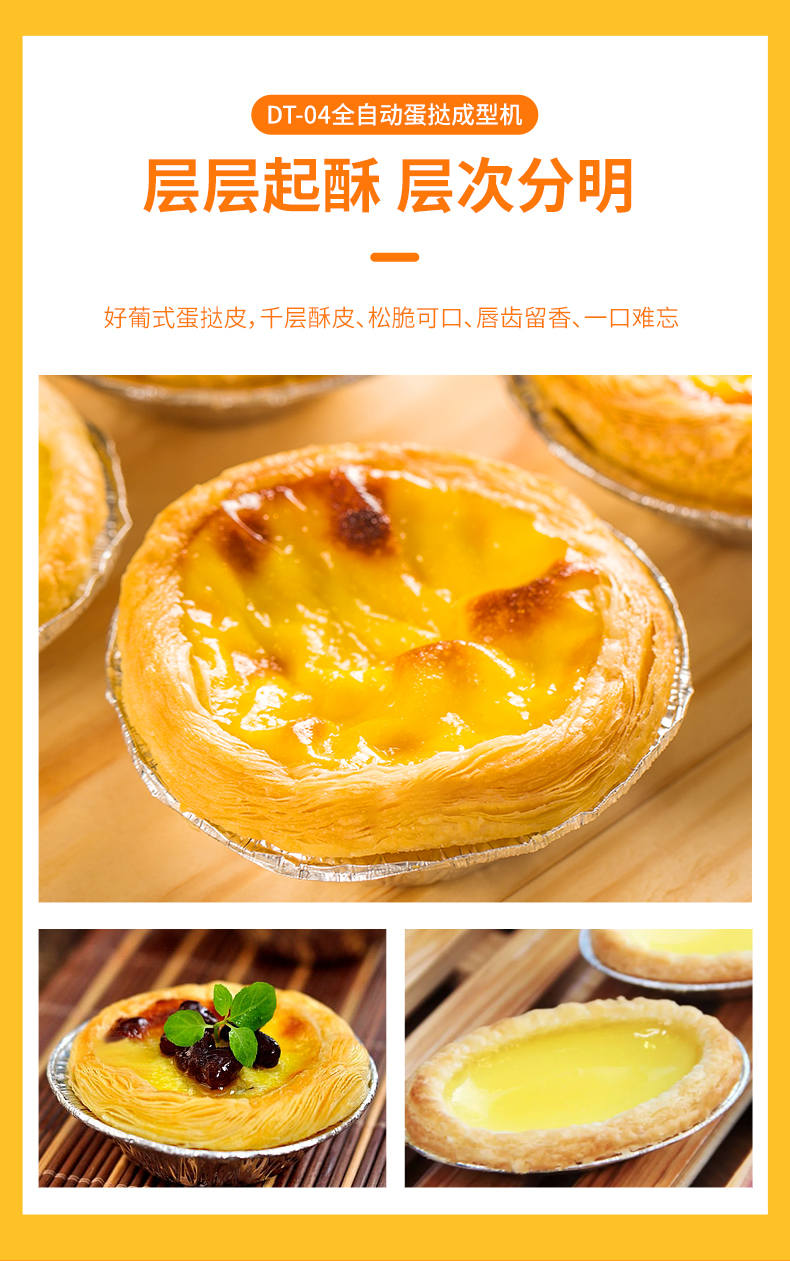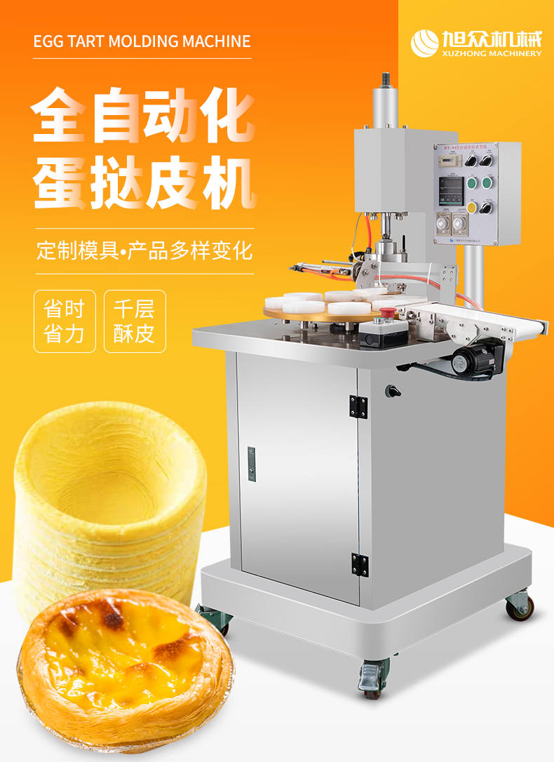 DT-04全自動蛋撻成型機(jī),2-3秒快速成型。該機(jī)應(yīng)用于傳統(tǒng)蛋撻、葡式蛋撻及其它須印型之產(chǎn)品突破傳統(tǒng)用手捏,采用微電子控制成型,一個2-3秒,高效率。大小均勻一次成型按鍵操作簡單準(zhǔn)確,成型效果好,厚薄均勻,大小統(tǒng)-。層層起酥層次分明好葡式蛋撻皮,千層酥皮、松脆可口、唇齒留香、一口難忘。