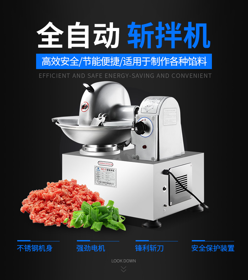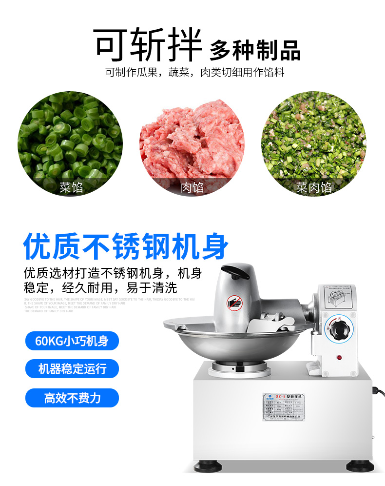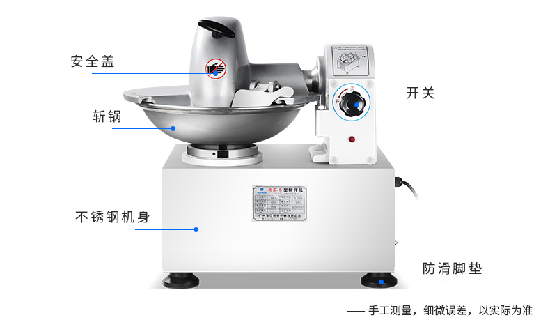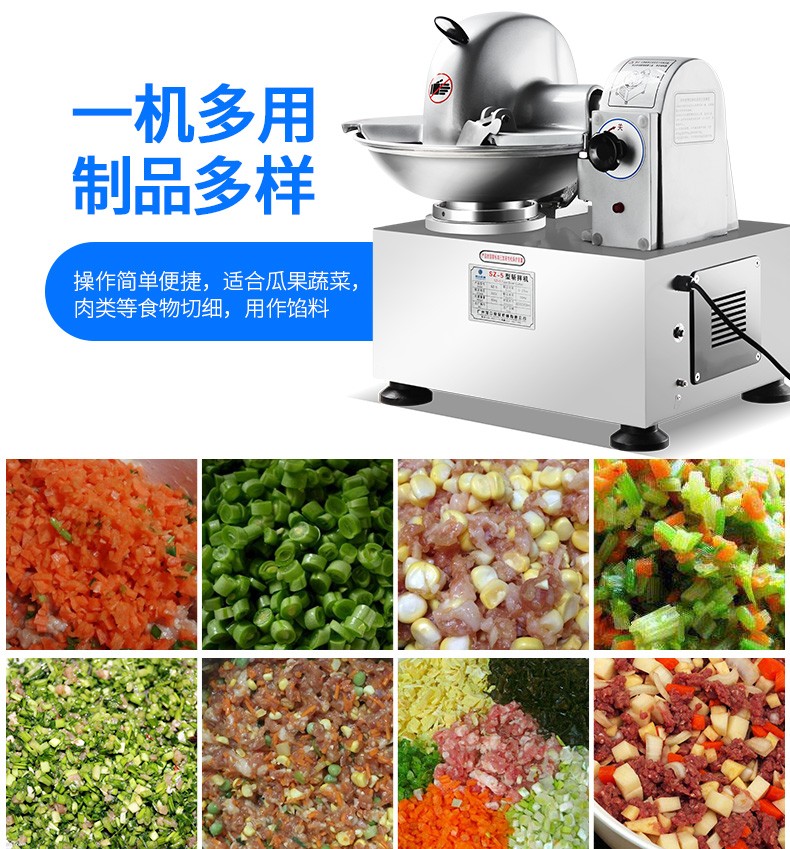 SZ-5型斬拌機(jī),全自動(dòng)斬拌機(jī),高效安全、節(jié)能便捷、適用于制作各種餡料??蓴匕瓒喾N制品,可制作瓜果,蔬菜,肉類切細(xì)用作餡料。優(yōu)質(zhì)選材打造不銹鋼機(jī)身,機(jī)身穩(wěn)定,經(jīng)久耐用,易于清洗。