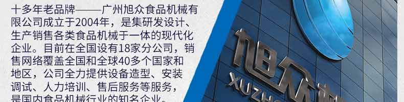 廣州旭眾食品機(jī)械有限公司是一家集科研開發(fā),生產(chǎn)設(shè)計(jì),營(yíng)銷服務(wù)為一體的現(xiàn)代化生產(chǎn)企業(yè)。現(xiàn)代化生產(chǎn)車間,精湛制造技術(shù),所產(chǎn)機(jī)械歷經(jīng)市場(chǎng)重重考驗(yàn),不斷贏得海內(nèi)外客戶的贊譽(yù)。