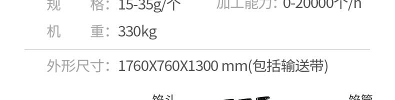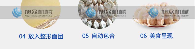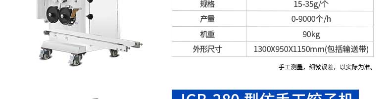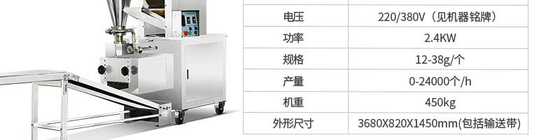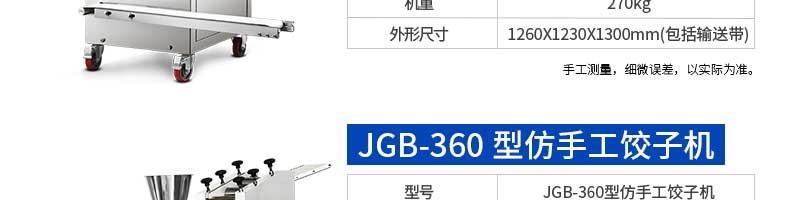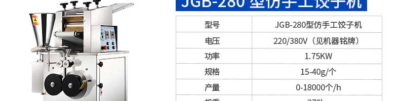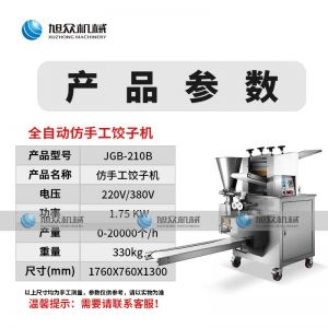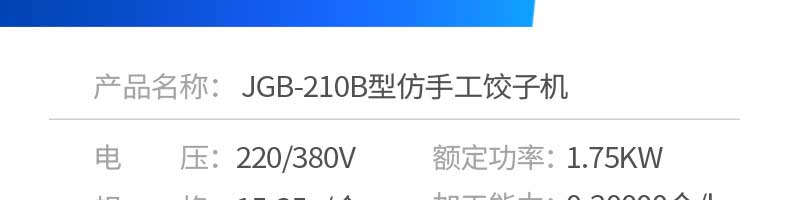 名稱JGB-210B仿手工餃子機 電源220/380v 功率1.75kw 產(chǎn)量0-20000個/h 尺寸1760*760*1300mm 重量330kg 規(guī)格15-35g/個 其他