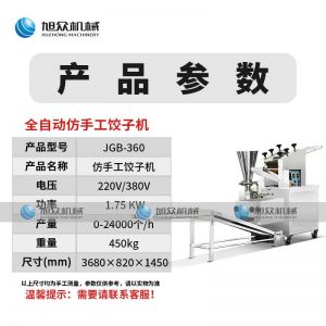 名稱JGB-360仿手工餃子機 電源220/380v 功率1.75kw 產(chǎn)量0-24000個/h 尺寸3680*820*1450mm 重量450kg 規(guī)格12-38g/個 其他