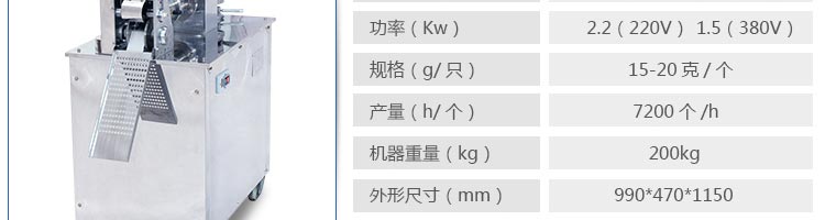 名稱JGB-120-5B型餃子機(jī) 電源220/380V(見機(jī)器名牌) 功率2.2kw(220V)1.5KW(380V) 產(chǎn)量7200個(gè)/小時(shí) 尺寸外形尺寸770*460*1190mm 重量200kg 規(guī)格15-20克/個(gè) 其他