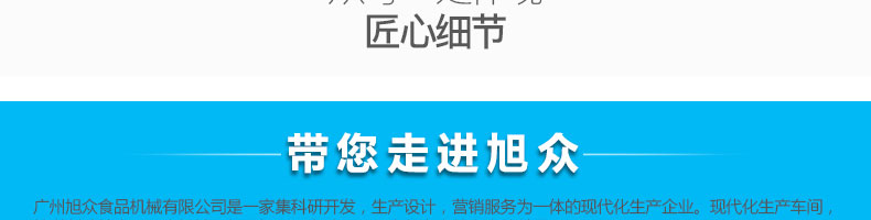 廣州旭眾食品機(jī)械有限公司是一家集科研開(kāi)發(fā),生產(chǎn)設(shè)計(jì),營(yíng)銷(xiāo)服務(wù)為一體的現(xiàn)代化生產(chǎn)企業(yè)?,F(xiàn)代化生產(chǎn)車(chē)間,精湛制造技術(shù),所產(chǎn)機(jī)械歷經(jīng)市場(chǎng)重重考驗(yàn),不斷贏得海內(nèi)外客戶的贊譽(yù)。