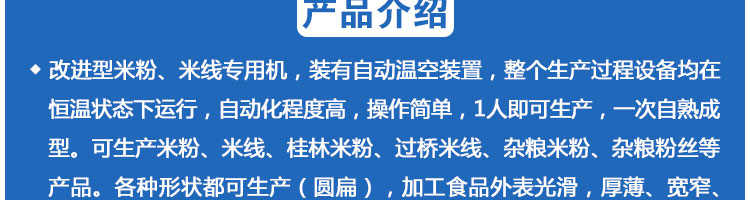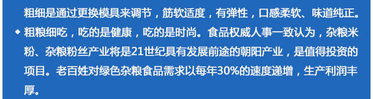 SZ-400多功能米粉機,生產(chǎn)多樣性可生產(chǎn)米粉、米線、粉絲、粉條、、年糕、玉米面條、各種雜糧粉絲、各種面條、雜糧面條、彩色面條以及以紅薯、玉米、大豆、蠶豆等制成淀粉為原料的等多種食品而且每種食品厚薄、粗細(xì)等規(guī)格可根據(jù)需要任意調(diào)整。