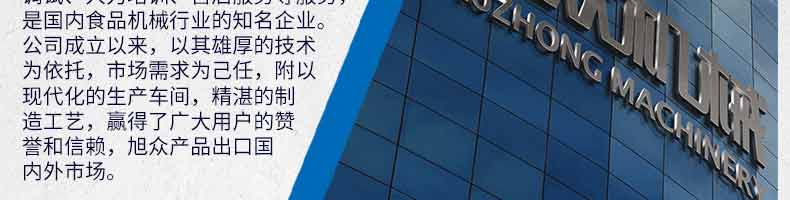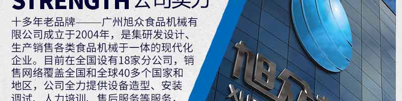 廣州旭眾食品機械有限公司是一家集科研開發(fā),生產(chǎn)設計,營銷服務為一體的現(xiàn)代化生產(chǎn)企業(yè)?,F(xiàn)代化生產(chǎn)車間,精湛制造技術,所產(chǎn)機械歷經(jīng)市場重重考驗,不斷贏得海內(nèi)外客戶的贊譽。