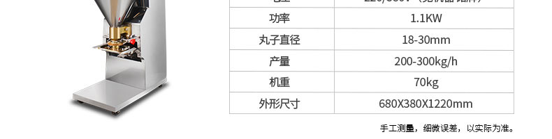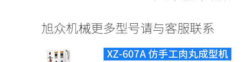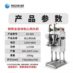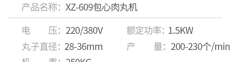 名稱XZ-609包餡肉丸機 電源220/380v 功率1.5kw 產(chǎn)量200-300個/min 尺寸730*540*1780mm 重量250kg 規(guī)格丸子直徑:28-36mm 其他