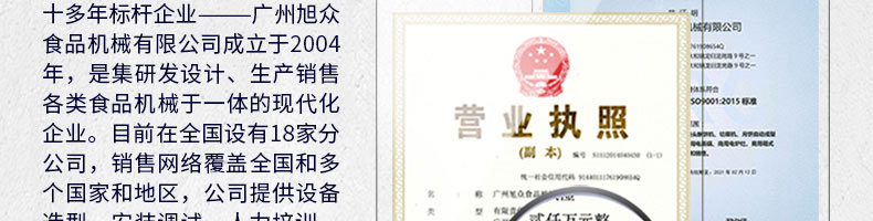 廣州旭眾食品機械有限公司是一家集科研開發(fā),生產(chǎn)設(shè)計,營銷服務(wù)為一體的現(xiàn)代化生產(chǎn)企業(yè)。現(xiàn)代化生產(chǎn)車間,精湛制造技術(shù),所產(chǎn)機械歷經(jīng)市場重重考驗,不斷贏得海內(nèi)外客戶的贊譽。