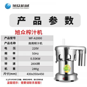 名稱WF-A2000商用榨汁機 電源220V 功率0.55kw 產(chǎn)量轉(zhuǎn)速:2800r/min 尺寸430*350*450mm 重量26kg 規(guī)格 其他