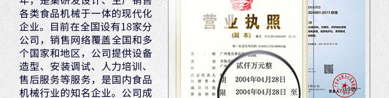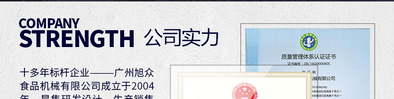 廣州旭眾食品機械有限公司是一家集科研開發(fā),生產(chǎn)設(shè)計,營銷服務(wù)為一體的現(xiàn)代化生產(chǎn)企業(yè)?,F(xiàn)代化生產(chǎn)車間,精湛制造技術(shù),所產(chǎn)機械歷經(jīng)市場重重考驗,不斷贏得海內(nèi)外客戶的贊譽。
