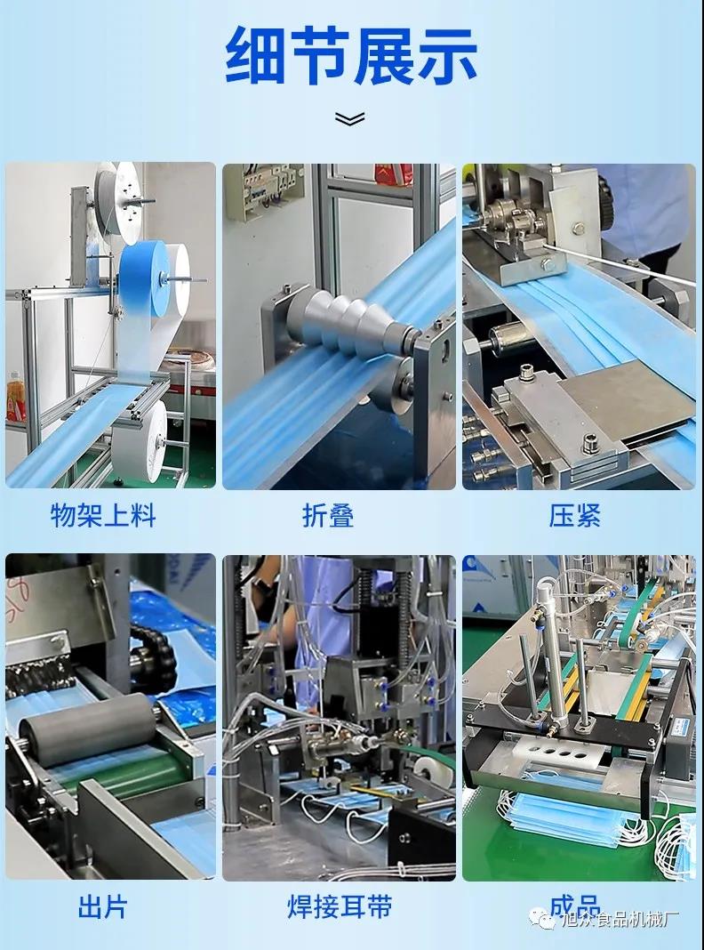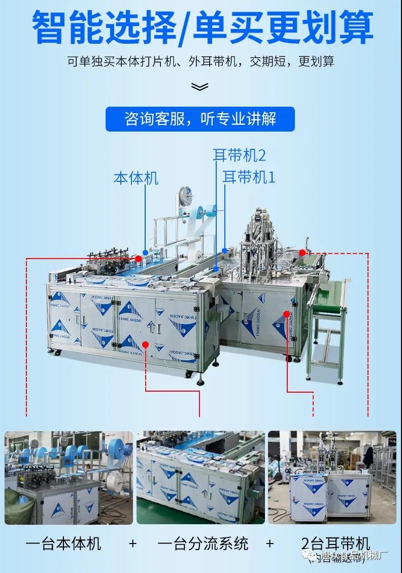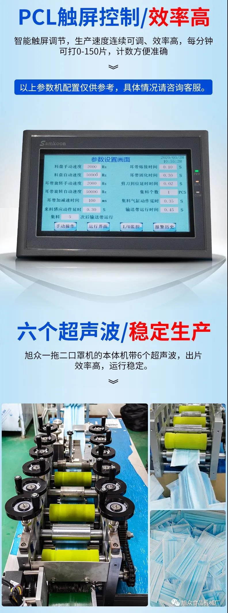 旭眾牌一拖二口罩機(jī)由一臺(tái)本體機(jī)帶動(dòng)兩臺(tái)耳帶機(jī)組成。本體機(jī)輸出ロ罩本體后,由輸送帶結(jié)構(gòu)將口罩本體片輸送到連接耳帶機(jī)的輸送帶上,再通過(guò)輸送帶將口罩片輸送到耳帶機(jī)的正面第一個(gè)口罩盤(pán)上方,最后通過(guò)氣缸下壓把口罩片放置到耳帶機(jī)的口罩盤(pán)內(nèi),后續(xù)由耳帶機(jī)完成口罩的耳帶熔接,包邊等動(dòng)作,從而完成一個(gè)耳帶口罩產(chǎn)品的生產(chǎn)。本機(jī)采用PLC、觸摸屏控制、主傳送帶采用單相馬達(dá)輸送、步進(jìn)馬達(dá)翻轉(zhuǎn),傳動(dòng)精確,控制穩(wěn)定,速度可調(diào)。
